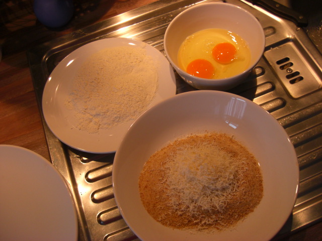 Panierstraße: Mehl -> Ei -> Semmelbrösel mit Parmesan