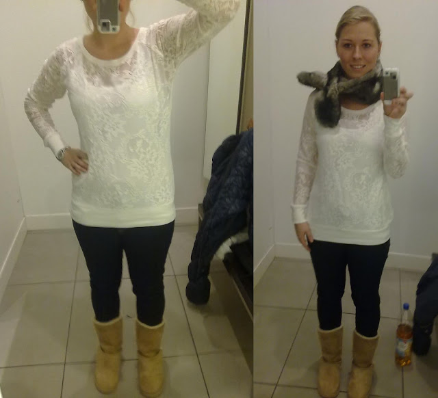 Spitzenpulli, Pelzschal – Ann-Christine , Treggins – Pimkie , Boots, Daunenjacke – H&M