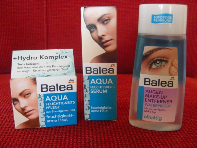 Balea Aqua Feuchtigkeitspflege und Serum. Die Creme habe ich jetzt seit einiger Zeit schon in Benutzung und finde sie richtig gut, sie spendet super Feuchtigkeit und riecht total erfrischend! Normalerweise benutze ich den Bebe AMU Entferner, aber den gabs nicht, also durfte der von Balea mit, mal testen, wie der so ist.