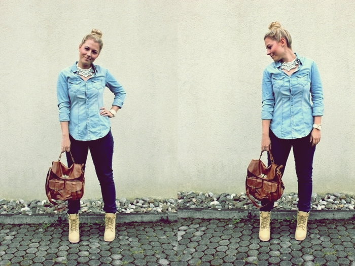 Outfit: Jeans Blouse, Pant, Necklace – H&M | Boots – Tally Weijl | Satchel Bag – Ernstings Family | Watch – GUESS