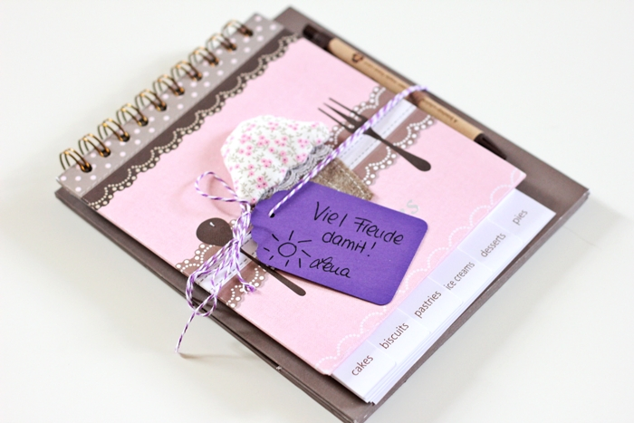 Es ist einfach perfekt für mich, rosa, verspielt, einfach zuckersüß! Ich bin schon fleißig am Rezepte heraussuchen, die ins Büchlein sollen. Das Beste an dem Rezeptbüchlein ist aber, dass man es aufstellen kann und so gleich platzsparend neben seine Backutensielen platzieren kann.