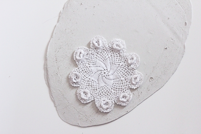 4. Schritt: Wenn Ihr jetzt das Häckeldeckchen abnehmt habt Ihr einen schönen Abdruck der Spitze oder Häckelei.