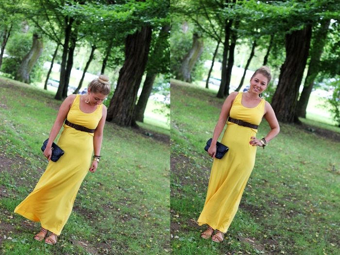 Outfit: Yellow Maxi Dress – AX Paris | Jeans Jacke – Primark | gesteppte Clutch – Orsay | Gürtel – Tally Weijl | Sandalen – H&M Kinderabteilung | Ohrringe – H&M