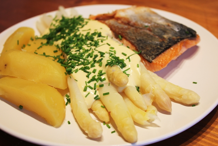 Ich kaufe den Spargel beim Bauern und lasse ihn dort gleich schälen. Falls der Lachs noch nicht entschuppt ist, mit dem Messer gegen die Schuppen raspeln und unter fließenden Wasser nochmals abwaschen. Kartoffeln schälen, vierteln und in einen Topf mit kaltem Salzwasser geben. Die Kartoffeln ca. 30 Minuten kochen lassen. Den Spargel in einem Sud aus Wasser, Essig und Zucker ca. 20 – 25 Minuten kochen. Wenn Spargel und Kartoffeln fast fertig sind den Lachs von beiden Seiten würzen und mit Mehl mehlieren. Dann in einer heißen Pfanne mit etwas Öl, auf der Hautseite zuerst, anbraten. Wenn der Lachs außen schön rosa ist, Pfanne ausschalten und mit den Beilagen anrichten. Hollandaise Packung aufschneiden, in einer Schüssel in der Mikrowelle erwärmen und über den Spargel geben. Zum Schluss alles mit Schnittlauch besträuen und genießen! Guten Appetit!