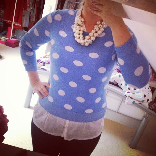 Outfit: weiße Baumwollbluse – ZLZ | gepunkteter Pulli – Persunmall | Jeans – TallyWeijl | Perlenkette – Zara