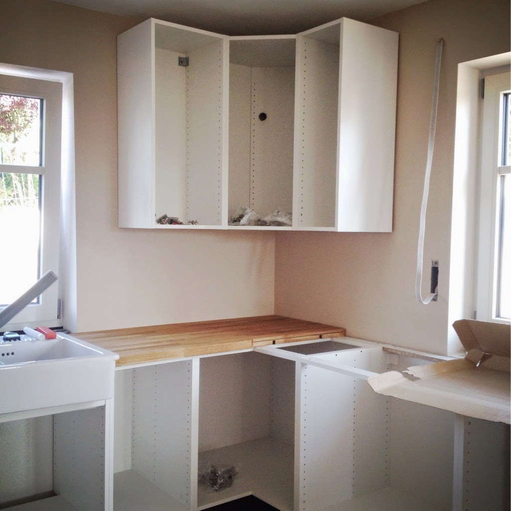 Endlich ist es soweit! Seit ein paar Tagen schrauben wir also unsere Traumküche zusammen. Ich hatte Euch ja schon letztes Jahr mal gezeigt, wie die Küche ungefähr aussehen soll. Und so ist sie auch geworden. Wir haben sie letztes Jahr im Dezember bei Ikea gekauft, da gab es 20% (Faktum geht aus dem Sortiment) auf Küchen und so haben wir zugeschlagen. Im Februar wurde sie geliefert und jetzt sind wir am aufbauen! Zuerst einmal wurden alle Pakete sortiert und dann beschriftet. Sonst wäre beim Aufbau wohl das pure Chaos ausgebrochen. Wir haben mit den Eckschränken angefangen und uns dann nach links und rechts hin gearbeitet. Zuersteinmal alle Schränke aufstellen, dann mit der Wasserwage ausrichten und dann mit Schrauben verbinden, damit eine feste Einheit entsteht. Anschließend haben wir die Spülmaschine eingepasst, was sich als garnicht so leicht herausstellte und wir wegen der Höhe etwas improvisieren mussten (Opa hat zwei Balken als Podest zurecht gesägt!). Anschließen wurde die Arbeitsplatte, unter der die Spülmaschine mit Winkeln an den Hochschrank geschraubt. So kann die Spülmaschine bei einem Defekt ganz einfach nur herausgezogen werden und man muss nicht die Arbeitsplatte abschrauben.