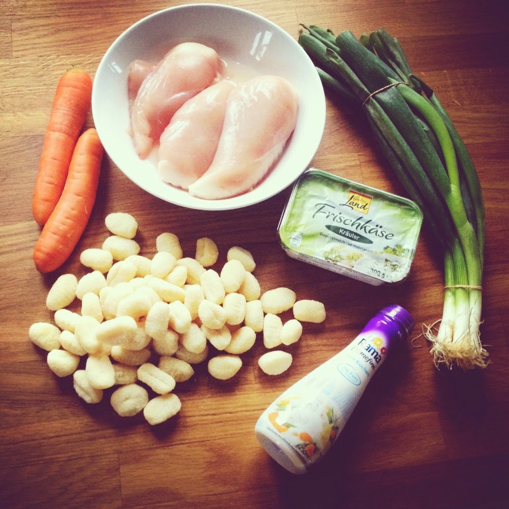 Hähnchenbrust waschen und trocken tupfen. In Stücke schneiden und mit Salz, Pfeffer, Knoblauch und Rosmarin würzen und in einer heißen Pfanne scharf anbraten. In der Zwischenzeit die Karotten und Lauchzwiebeln schälen und in Stücke schneiden. Mit den ungekochten Gnocchi in eine große Auflaufform geben und etwas durchmischen. Das angebratene Fleisch in die Auflaufform geben und den Frischkäse, Rama Cremefine und etwas Wasser in der Pfanne köcheln lassen. Nach Belieben würzen und anschließend in die Auflaufform geben. Jetzt bei 180 °C für 25 Minuten in den Backofen schieben und backen lassen. Lasst es Euch schmecken!!!
