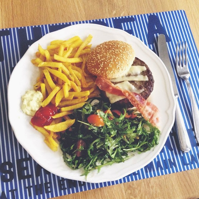 Mein Freund zaubert momentan die leckersten Sachen und ich darf natürlich auch mithelfen. Letztens gab es Cheeseburger mit selbstgemachten Pommes und Salat und am Ostersonntag hat er einen Zwiebelrostbraten mit frittierten Zwiebelringen, grünen Bohnen und Pommes gezaubert.