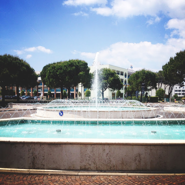 Der berühmte Brunnen von Bibione. Er ist genau vor der Therme, dem Hallenbad von Bibione. Hier kann man relaxen und entspannen, denn es gibt auch einen großen Spa Bereich. Der Brunnen ist in der Nacht toll beleuchtet und das Wasserspiel ist wunderschön. Als Fotomotiv ist er auch ziemlich gefragt.