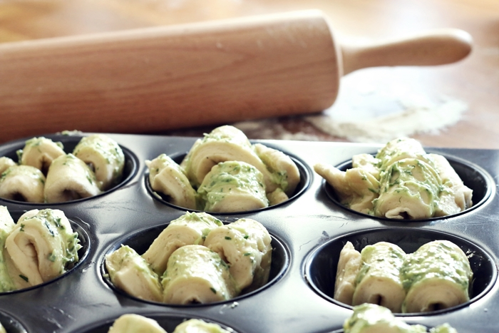 Wenn alles verstrichen ist, sollte es so aussehen. Falls die Kräuterbutter zu hart ist, gebt sie für 30 Sekunden in die Mikrowelle oder nehmt sie eine halbe Stunde bevor Ihr die Kräuterfaltenbrot Muffins backt aus dem Kühlschrank.