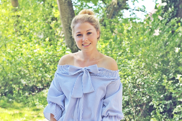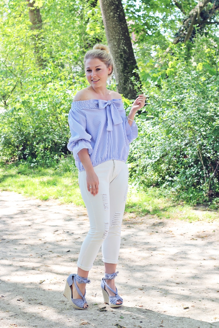 Jetzt aber auch mal ein paar Worte zu meinem neuen Outfit! Die wunderschöne gestreifte Off Shoulder Bluse habt Ihr ja schon auf Instagram gesehen, aber das dazugehörige Outfit wollte ich Euch nicht vorenthalten. Deswegen gibt es diesen sommerlichen Look heute auf dem Blog. Man kann die Bluse übrigens sowohl mit der Schleife vorne oder hinten tragen. Wie es einem gerade gefällt. Eine weiße Jeans, die etwas lockerer geschnitten ist hatte ich noch nicht im Schrank, deswegen kam mir diese hier ganz gelegen. Dazu dann noch meine weiß blau gestreiften Schnürwedges und fertig ist der Look!
