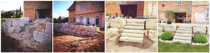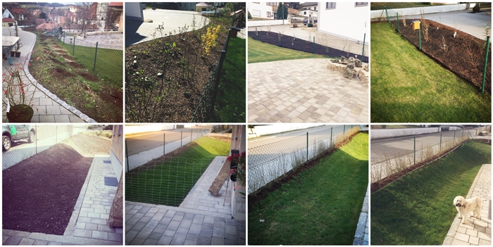 Ja, was ist im letzten Jahr alles passiert? Die wohl deutlichste Verwandlung hat wohl unser Garten durchgemacht! Es ist endlich grün geworden! Die braune Erdwüste hat sich in eine saftig grüne Oase verwandelt. Wir haben dem Garten ein Gesicht gegeben und schon einiges angepflanzt und mit Naturstein viel gestaltet. Aber das wichtigste war, dass wir unser Grundstück endlich einzäunen, damit Max frei laufen kann und wir nicht ständig gucken mussten, wo er gerade herum läuft. Wir haben also den Zaun aufgestellt, unsere Grünflächen mit Humus aufgefüllt und Rasen angesät (wisst Ihr noch wie heiß der Sommer letztes Jahr war? Ihr wollt nicht wissen, wie viel Liter Wasser wir verbraucht haben!), unsere Böschung angepflanzt und mit Natursteinen eine kleine Mauer gebaut, Treppenstufen gesetzt, die Einfahrt, Gehsteig und Terrassen gepflastert, Hecken gepflanzt, Vogelkästen aufgehängt, Gartenmöbel und einen Grill gekauft, unser Garagentor eingebaut, usw. Im Außenbereich ist wirklich sehr, sehr viel passiert und im Moment sind wir dabei unser Grundstück mit Natursteinquadern einzugrenzen und so ein bisschen den Höhenunterschied auszugleichen und den Boden zu befestigen. Wenn dann unser neuer Nachbar anfängt zu bauen, dann können wir auch endlich den Weg ums Haus fertig pflastern.