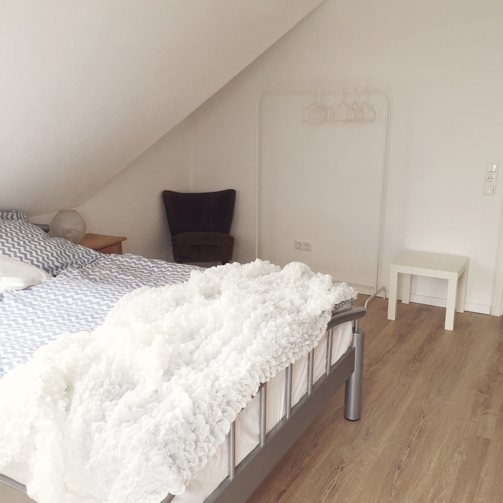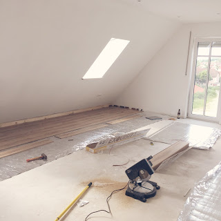Warum wir etwas Zeitdruck hatten seht Ihr hier. Vielleicht habt ihr es ja mitbekommen, aber vor zwei Wochen hatten wir Besuch von Julia & Manuel von Chicchoolee und da musste unser Gästezimmer fertig sein. Das war aber komplett vollgestellt mit Krimskrams, der die ganze Zeit im Tanzsaal gelagert hat. Da konnten wir es aber im Moment nicht rein stellen, da es noch keinen Boden gab und zu dreckig war. Da der Laminat ja dann noch rechtzeitig kam, konnten wir das Gästezimmer schön herrichten. Zwar etwas spartanisch, aber zum Schlafen reicht es auf alle Fälle. Mit der Zeit wird es auf jeden Fall noch wohnlicher werden.
