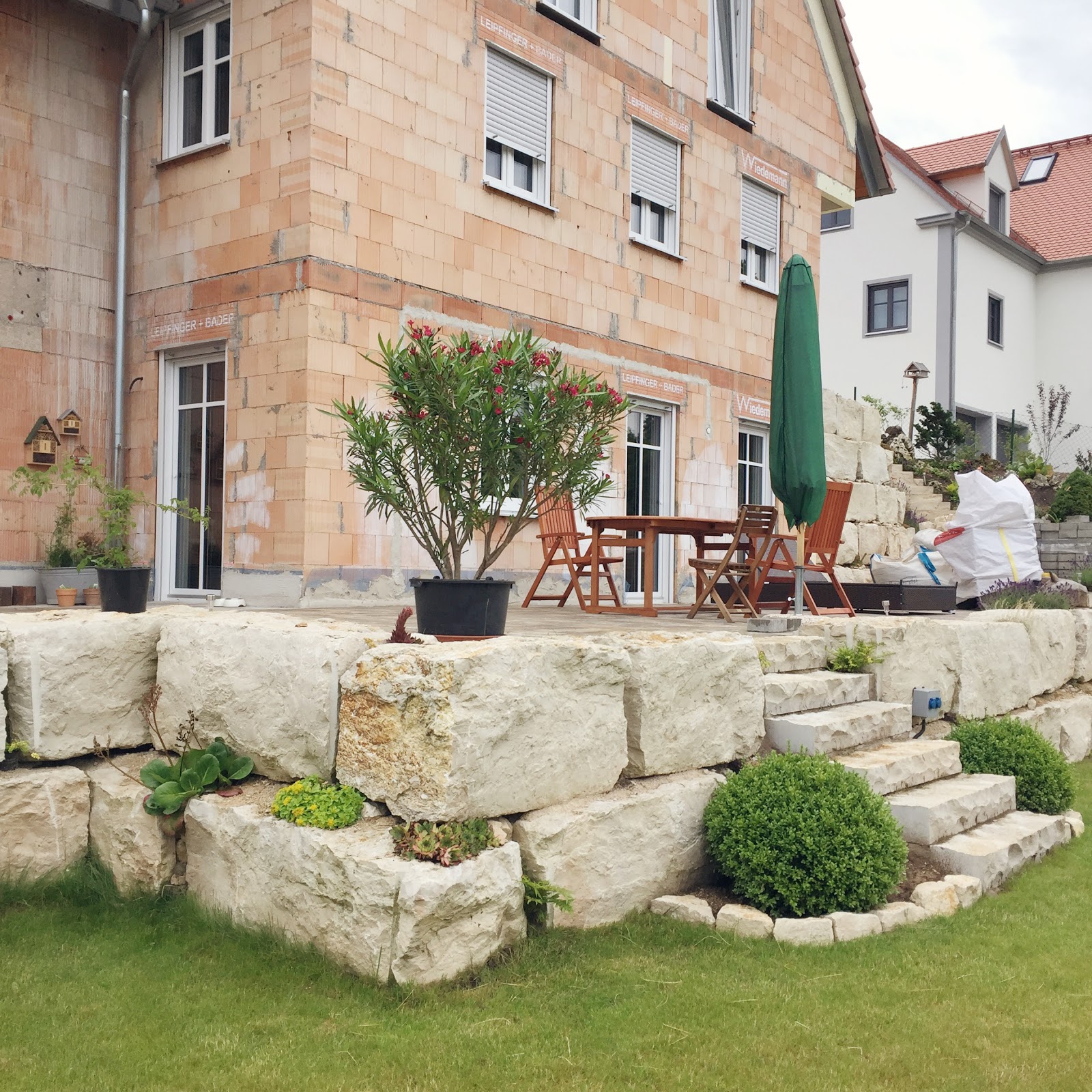 - Garten grob angelegt und Terrasse + Natursteinmauer gebaut / 62 Tonnen Steine gesetzt ✔ Hofsäulen betoniert ✔ Rabatten gesetzt für Hof und Weg ✔ Hof-Pflaster ausgesucht ✔ Einfahrt und Terrasse ein geschottert ✔ Pflaster bestellt: Sortett Selection Classic, Muschelkalk mix, Rocca fine ✔ Haussockel verputzt ✔ Einzeiler für Einfahrt, Weg und Obere Terrasse gesetzt ✔ Einfahrt, Weg und Obere Terrasse ein geschottert und gerüttelt ✔ Lichtschachttaufsatz gesetzt und befestigt ✔ Einfahrt, Weg und Obere Terrasse gepflastert und eingesandet ✔ Randstein für Einfahrt tiefer gesetzt ✔ Gehsteig gepflastert ✔ Sonnenschirm und Ständer gekauft ✔Vogelkästen im Garten aufgehängt ✔