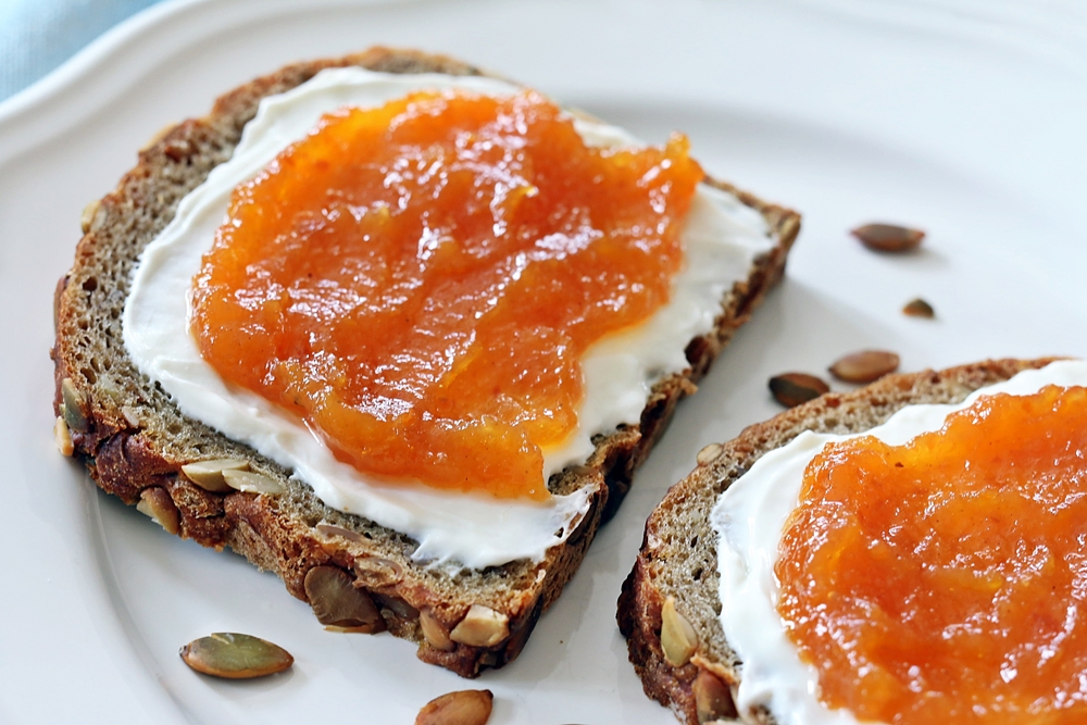 Die Kürbismarmelade schmeckt sowohl auf einem Brötchen mit Butter, auf einem Körnerbrot mit Frischkäse oder auch zu Käse. Probiert es einfach mal aus.
