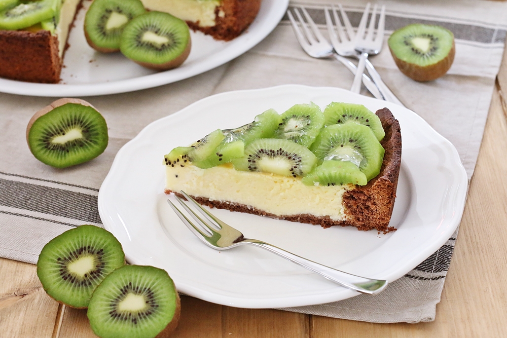 Für die Füllung wascht Ihr die Schüssel von gerade eben aus und gebt Zucker, Vanillezucker und Eier in die Rührschüssel und schlagt alles schaumig auf. Anschließend kommt Quark, Frischkäse, Vanillepuddingpulver und das Sonnenblumenöl dazu. Auf langsamer Stufe zu einer homogenen Masse verrühren und dann in die vorbereitete Springform füllen. Der Käsekuchen wird nun bei 170°C für 90 Minuten gebacken. Wenn der Kuchen an der Oberfläche schon vorher braun wird, deckt ihn mit Alufolie ab bzw. nehmt ihn kurze Zeit später schon aus dem Backofen. Den Käsekuchen auf einen Rost stellen und vollständig auskühlen lassen, bevor es mit dem Belag und Tortenguss weiter geht. Während der Kuchen auskühlt kann man die Kiwis schälen und in gleich dicke Scheiben schneiden. Die Kiwi-Scheiben werden dann rund herum auf den Kuchen gelegt und so die komplette Oberfläche bedeckt. Den Tortenguss nach Anleitung zubereiten und über die Kiwis geben, darauf achten, dass alles mit dem Guss gut bedeckt ist. Nun muss der Guss fest werden und danach kann der Kiwi-Käsekuchen mit Schokoboden auch schon aus der Form gelöst und angeschnitten werden.