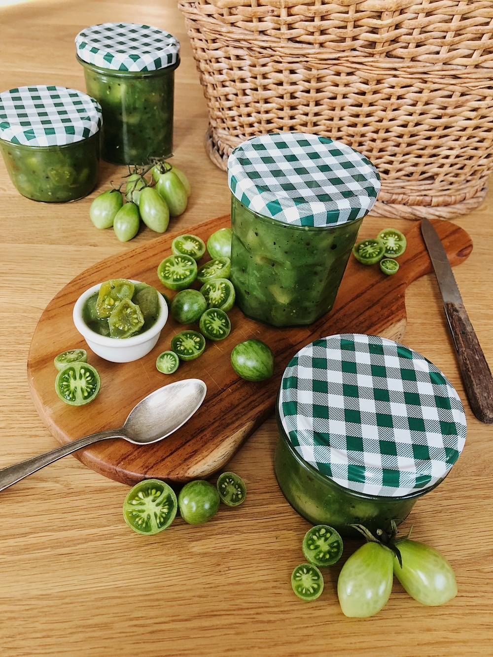 Damit das grüne Tomaten Chutney auch schön grün bleibt, habe ich etwas mit Lebensmittelfarbe nachgeholfen. Zum Schluss alles abschmecken und mit etwas Speisestärke abbinden, falls das Chutney zu flüssig sein sollte. Dafür einfach etwas Saft vom Chutney abschöpfen, in eine Schüssel geben und mit der Stärke vermischen. Diesen Mix zurück in den Topf schütten und alles gut umrühren. Noch einmal kurz aufkochen lassen (fünf bis sieben Minuten) und dann heiß in sterilisierte Gläser (sehr heiß auswaschen) füllen, verschließen, für fünf Minuten auf den Kopf stellen, dann wieder umdrehen und auskühlen lassen.