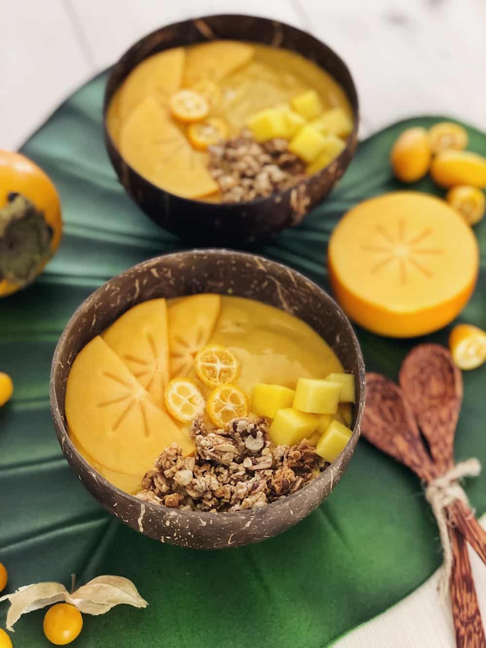 Mir persönlich schmeckt die Smoothie Bowl am besten, wenn die Bananen vorher eingefroren werden. Theoretisch könnt Ihr auch die Mango (zuvor den schälen, den Kern entfernen und würfeln) und den Joghurt einfrieren und dann alles zusammen in den Mixer geben. Friert also die geschälten und in Stücke geschnittenen Bananen am Vortag oder mindestens fünf Stunden bevor Ihr die Smoothie Bowl machen wollt ein, damit alles eiskalt und gefroren ist. Wenn alles soweit vorbereitet wurde, kann es losgehen. Gebt die gefrorenen Bananen in den Mixer und lasst ihn so lange laufen, bis die Bananenmasse richtig cremig ist uns aussieht wie Speiseeis. Jetzt kann man das Bananeneis heraus nehmen und mit der Mango und dem Kokosjoghurt weiter machen oder direkt alle Zutaten mit in den Mixer geben und wieder vermixen, bis keine Stücke mehr zu sehen sind. Füllt die Smoothie-Masse in zwei Schüsseln und garniert Eure Bowl zum Beispiel mit Kaki, Kumquats, Physalis, Mandarinen, usw. Da es ja eine gelbe Smoothie Bowl ist, macht sich hier gelbes bzw. oranges Obst sehr gut. Zum Schluss noch ein bisschen Knuspermüsli on Top und fertig ist die gelbe Smoothie Bowl!