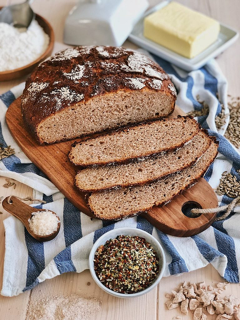 Das Brot ganz frisch essen, so schmeckt es am besten und die Kruste ist schön knusprig. Gebt etwas weiche Butter auf eine Brotscheibe und streut ein bisschen vom Stullen Spice (Just Spices) darauf. Dann rein beißen und genießen. Unglaublich gut und man braucht nichts mehr anderes! Das Brot hält sich mehrere Tage im Brotkasten und kann auch eingefroren werden.