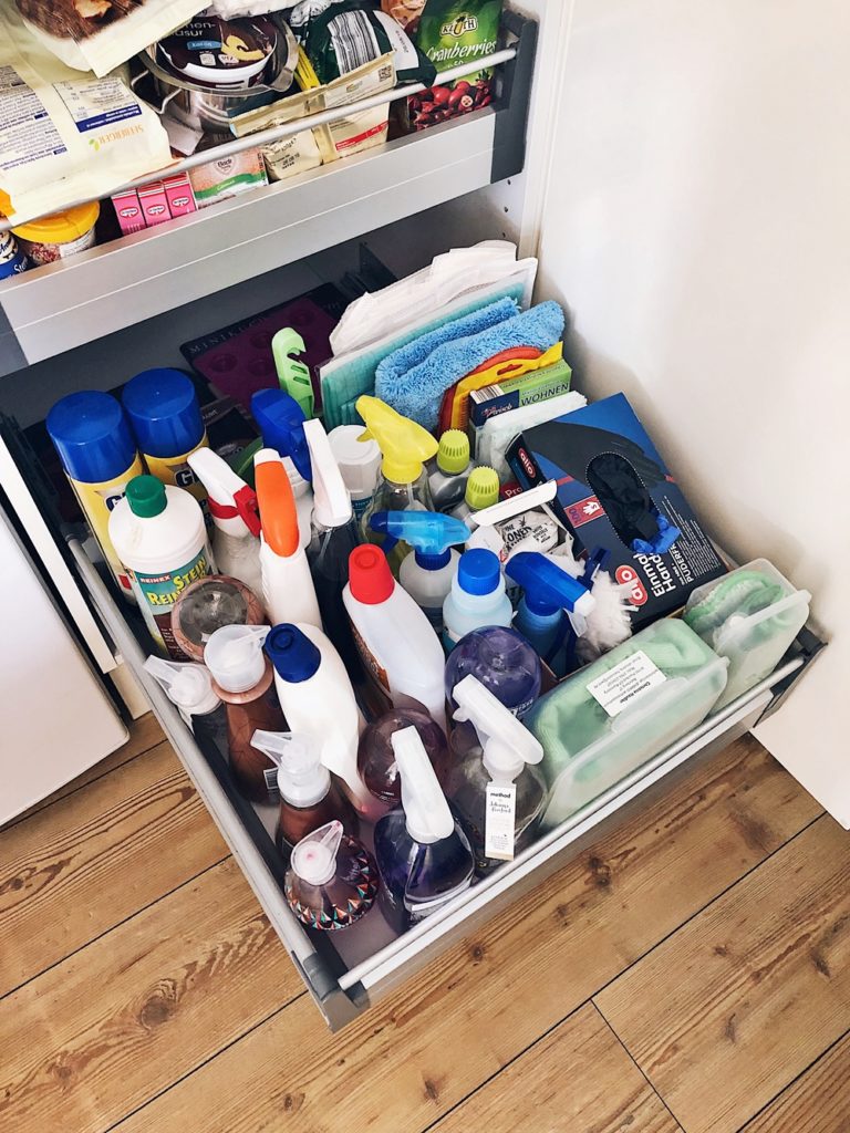 Und ganz unten bewahre ich das Putzzeug auf. Ich muss sagen, ich bin sehr sparsam, was die Verwendung von Putzmitteln angeht und nehme immer eher weniger als zu viel. So dauert es ziemlich lange, bis so eine Flasche aufgebraucht ist. Ich habe hier schon ewig nichts mehr Neues gekauft und möchte auch erst einmal alles leer machen, bevor wieder etwas gekauft wird.