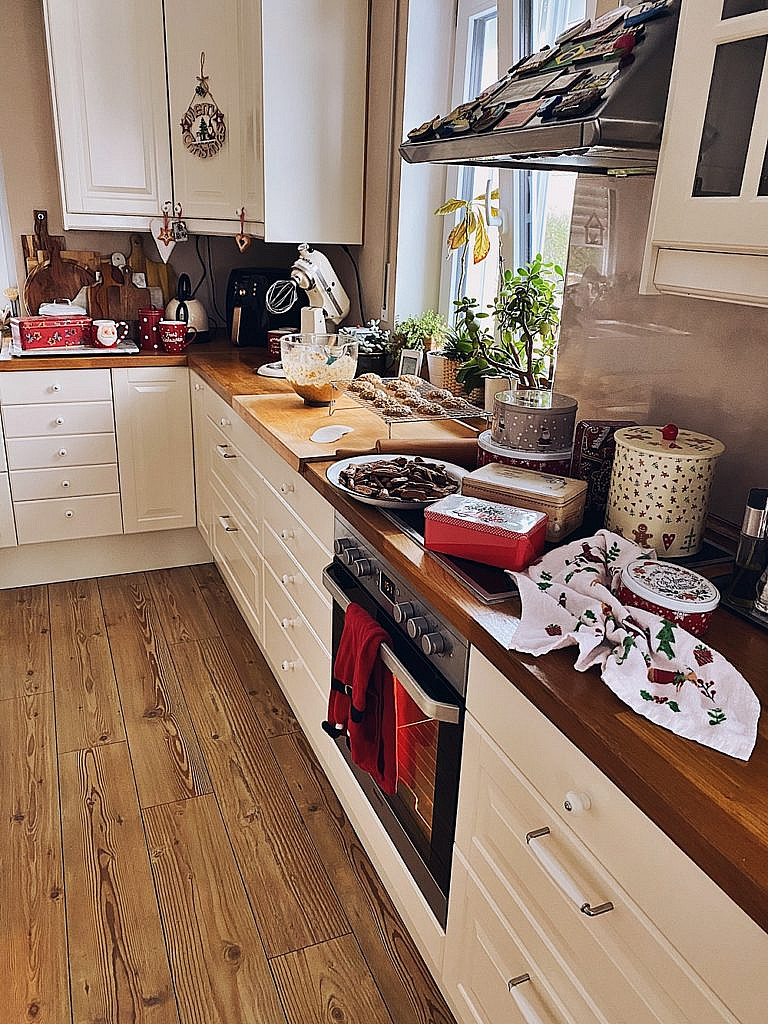 Die Küche ist selbstverständlich auch ein bisschen dekoriert. Ein paar Kerzen, ein Weihnachtsmann, Tannenbäumchen, ein kleines Tablett mit Kugeln und Teelichtern. Dazu an an ein paar Schubladen und Griffen, Anhänger und Deko aus Weihnachtsplätzchen.