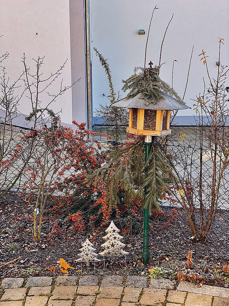 Im Garten ist die Dekoration eher schlicht gehalten. Für die Vögel gibt es jede Menge Futterhäuschen und Stationen. Das Futterhaus aus Holz hat mein Papa selbst gebaut. War super aufwendig, deswegen gibt es davon auch kein DIY.
