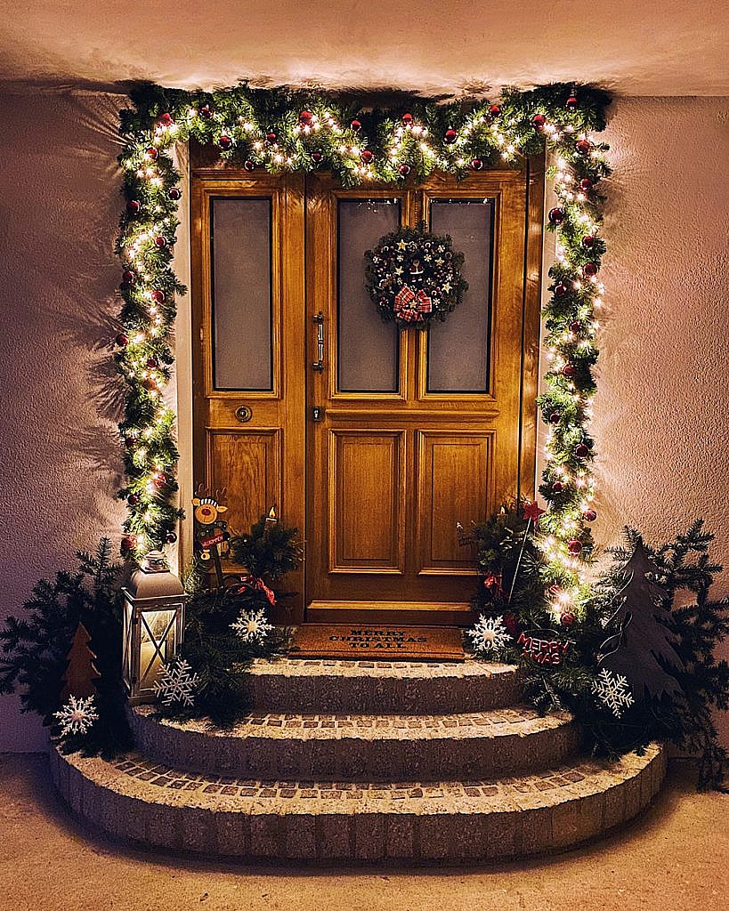 Ich befestige die Tannengirlande mit Schraubhaken, die jeweils oben und unten, links und rechts angebracht sind. Sie sind in Fassadenfarbe gestrichen, deswegen sieht man sie so nicht. Anschließend bringe ich die Lichterkette an, welche über eine Zeitschaltuhr gesteuert wird. Dann die Kugeln und zum Schluss kommt alle andere Deko, der Türkranz, Fußmatte, usw.