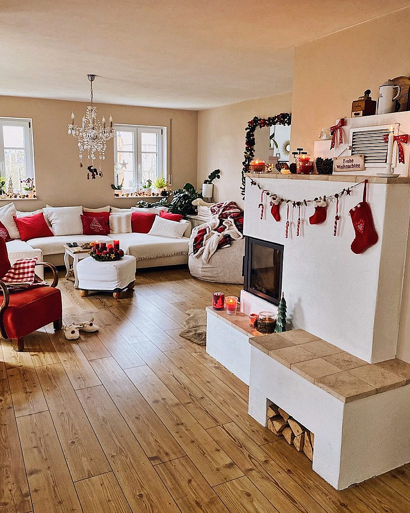 Ich mag es klassisch in rot, grün, weiß, gold. Das ist für mich Weihnachten. Ich beginne mit der Weihnachtsdekoration immer ein paar Tage vor dem 1. Advent. Damit bis dahin dann auch alles fertig ist. Ich brauche nämlich gut zwei Tage, damit alles komplett steht. Den Christbaum stelle ich meist erst ein paar Tage vor Heilig Abend auf. Das ist bei uns einfach so Tradition.