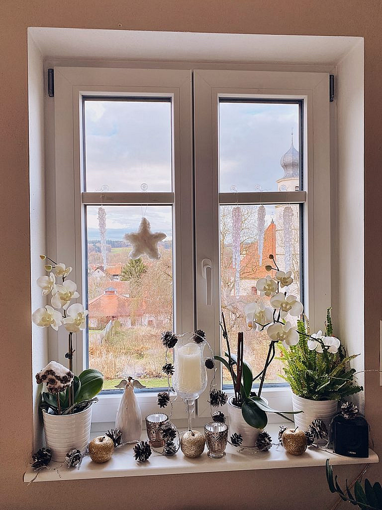 Bei der Deko auf den Fensterbrettern greife ich gerne auf unechtes Tannengrün zurück, das gibt es ganz günstig bei Tedi, Action, Kik, Nanu Nana, usw. Einfach auseinander machen und dann zwischen die Deko legen. Durch die unechten Zweige bleibt alles immer frisch und grün und man kann die Deko über Jahre verwenden.